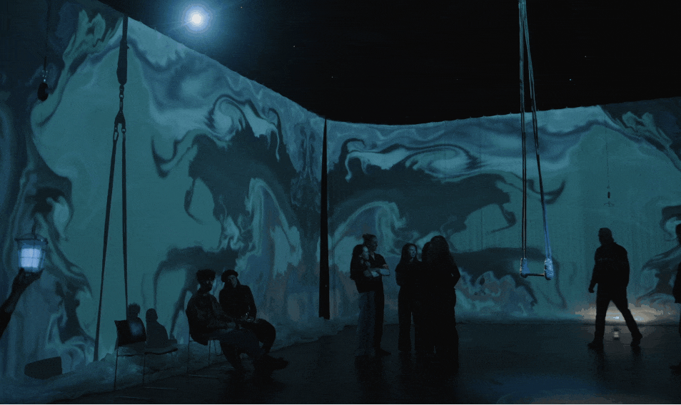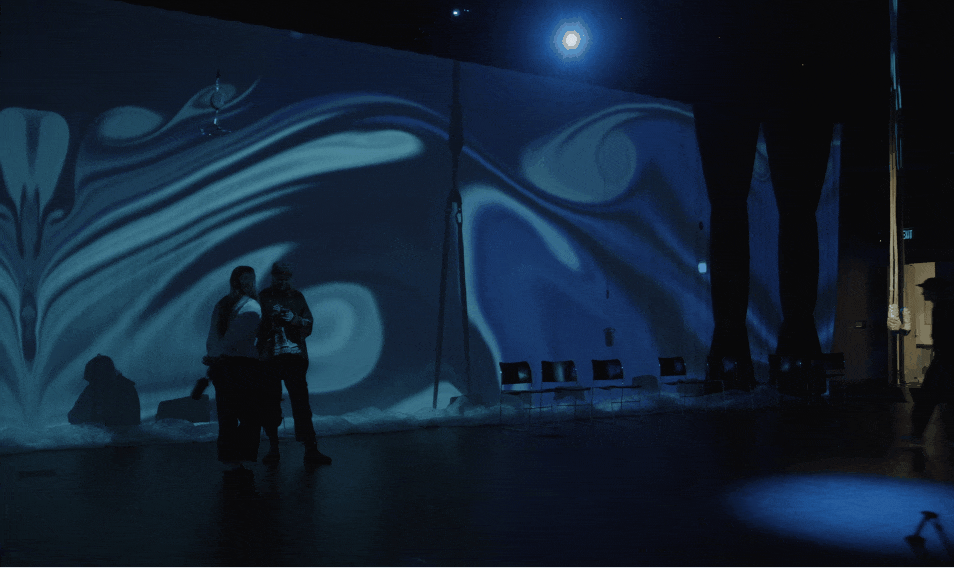 The movement data is mainly captured by and read from SOMI-1 wearable accelerometer sensors worn by the dancers; these values initiate paint bursts and new sounds. This sensor data is transmitted via Bluetooth as MIDI, triggering paint bursts in a real-time fluid simulation programmed in TouchDesigner (projected via Resolume) and complementary generative sounds in Ableton Live, all tuned to harmonize with an underlying soundscape. Additional motion data is captured through the motion capture cameras in the theater — the custom hanging lanterns function as interactive motion capture objects, their relative amplitudes modulating overarching qualities of both the projection and sound environment.