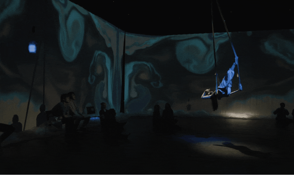 Presented as my Master's thesis, afloat is an immersive, collaborative moving meditation, guided by improvisational aerial dance and transformed by audience participation. Live movement data generates dynamic scene- and soundscapes, allowing our motion and stillness, our individual ebbs and flows, to be amplified and experienced together.